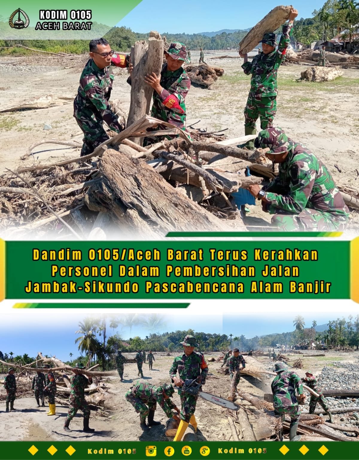 Menindaklanjuti kondisi tersebut, Dandim 0105/Aceh Barat langsung menginstruksikan para Danramil beserta personel di wilayah teritorialnya untuk segera bergerak melaksanakan karya bakti pembersihan jalan. Dandim menekankan pentingnya kehadiran TNI AD di tengah masyarakat, terutama dalam situasi darurat dan pascabencana.