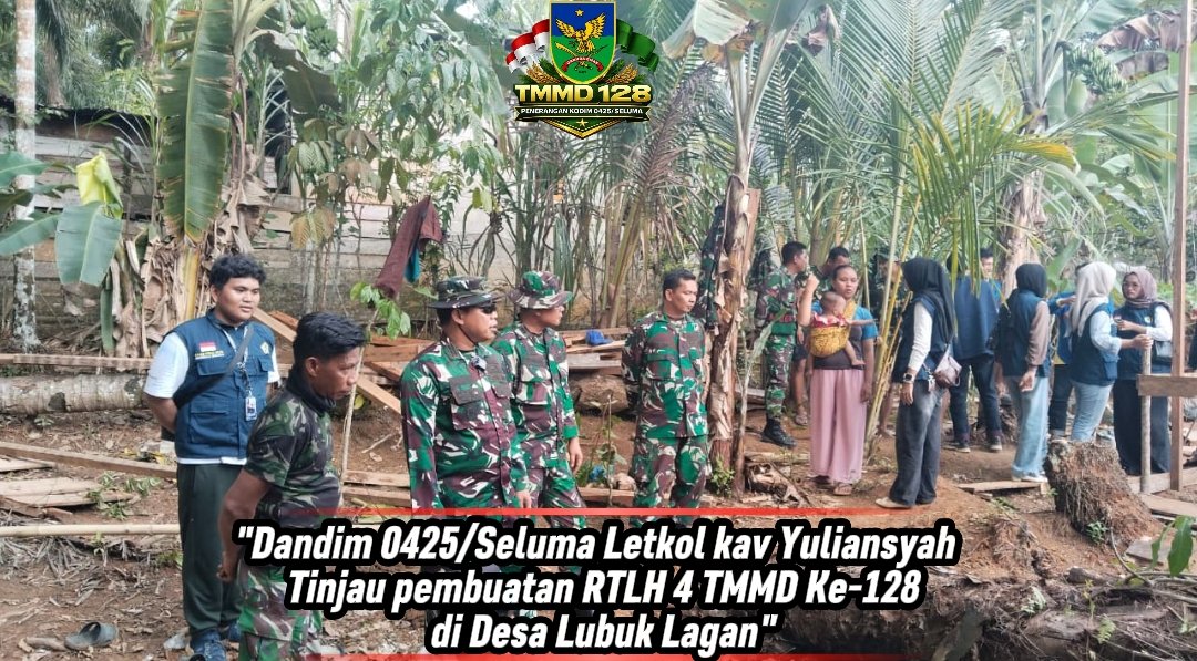 Seluma – Pada tanggal 28 April 2026, Komandan Kodim 0425/Seluma, Letkol Kav Yuliansyah, melakukan tinjauan terhadap pembangunan Rumah Tidak Layak Huni (RTLH) keempat dalam program TNI Manunggal Membangun Desa (TMMD) Ke-128 yang bertempat di Desa Lubuk Lagan, Kecamatan Talo Kecil. Kegiatan ini juga dihadiri oleh mahasiswa Kuliah Kerja Nyata (KKN) dari Universitas Bengkulu (UNIB) kelompok 107 yang dibimbing oleh Ir. Adhadi Kurniawan, S.T., M.Eng.