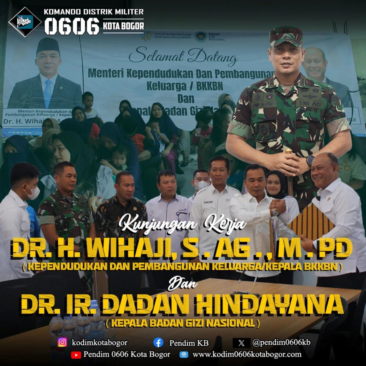 Bogor – Komandan Kodim (Dandim) 0606/Kota Bogor, Letkol Inf Dwi Agung Prihanto, S.Sos., M.Tr. (Han), mendampingi kunjungan kerja Menteri Kependudukan dan Pembangunan Keluarga/Kepala BKKBN, Dr. H. Wihaji, S.Ag., M.Pd., bersama Kepala Badan Gizi Nasional, Dr. Ir. Dadan Hindayana, di Satuan Pelayanan Pemenuhan Gizi (SPPG), Jalan Kol. Enjo Martadisastra III, Kelurahan Kedung Badak, Kecamatan Tanah Sareal, Kota Bogor, Senin (20/01/2025).
