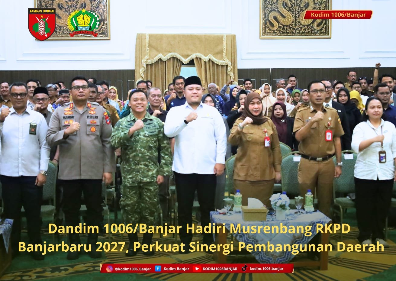 Banjarbaru – Komandan Kodim (Dandim) 1006/Banjar Letkol Inf Bambang Prasetyo Prabujaya, S.Hub.Int., M.Han menghadiri kegiatan Musyawarah Perencanaan Pembangunan (Musrenbang) Rencana Kerja Pemerintah Daerah (RKPD) Kota Banjarbaru Tahun 2027 yang digelar di Aula Gawi Sabarataan, Pemko Banjarbaru, Senin (30/3/2026).