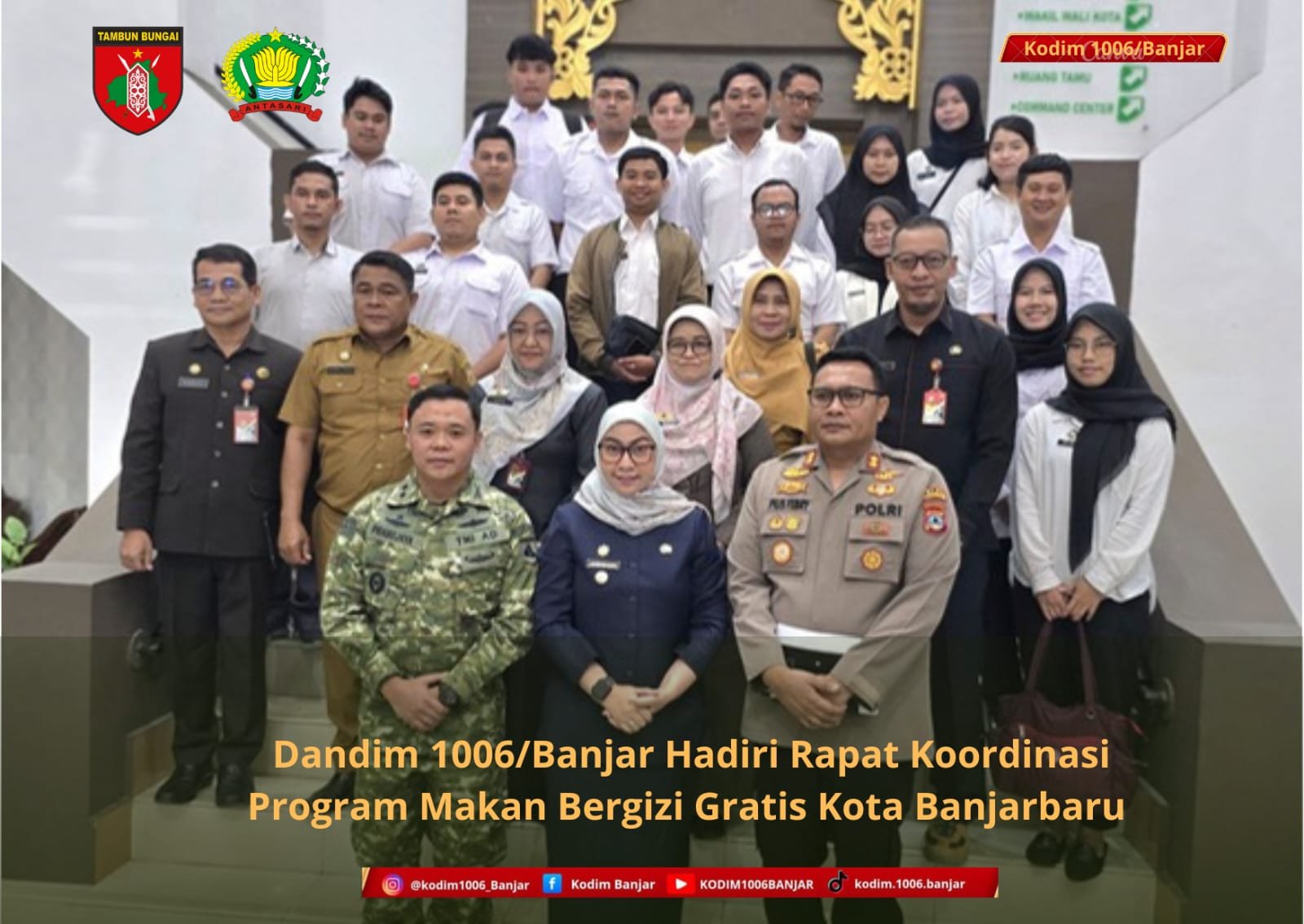 Banjarbaru – Komandan Kodim 1006/Banjar Letkol Inf Bambang Prasetyo Prabujaya, S.Hub.Int., M.Han. menghadiri Rapat Koordinasi Program Makan Bergizi Gratis (MBG) yang digelar Pemerintah Kota Banjarbaru, Selasa (14/10/2025)