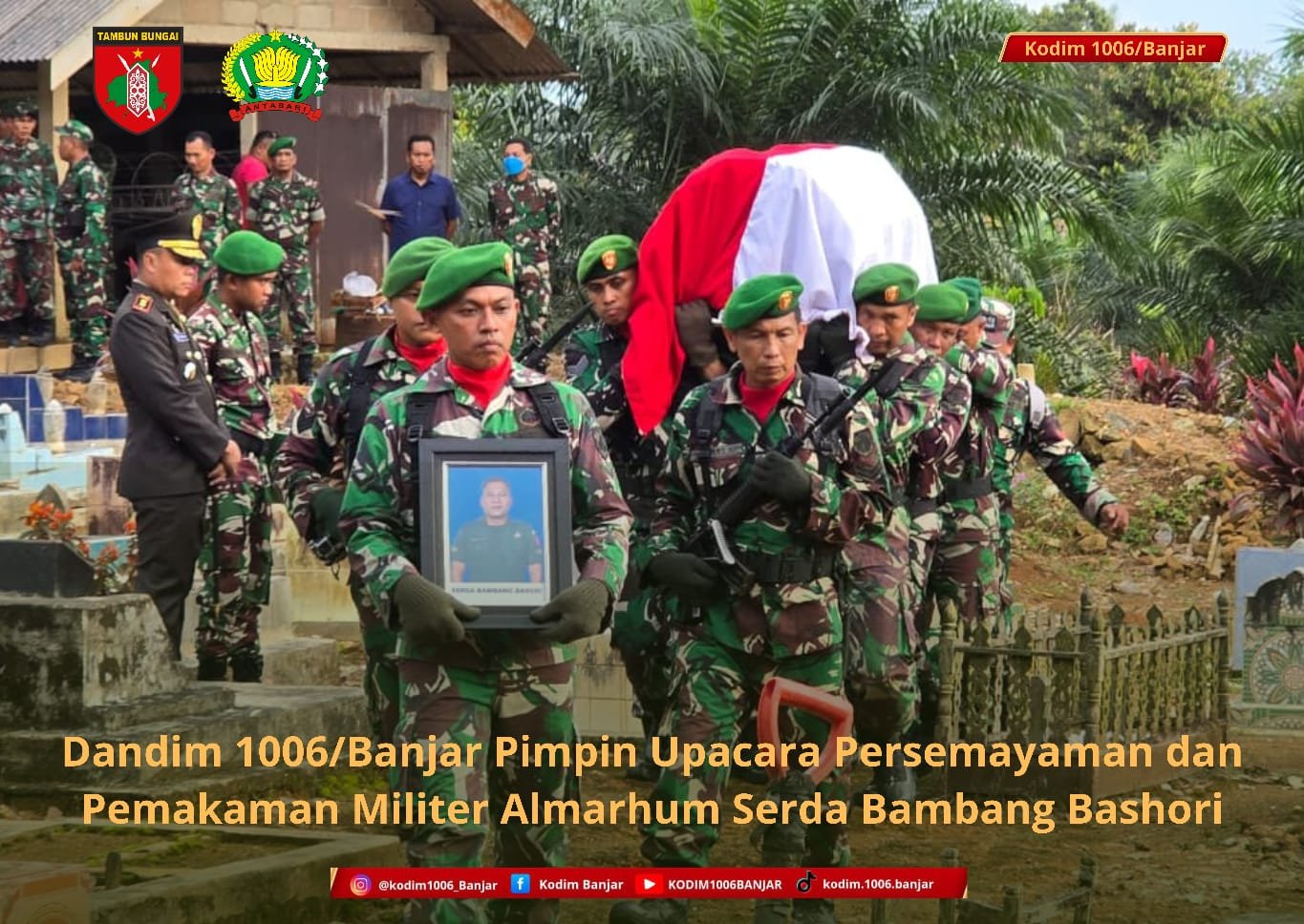 Prosesi pemakaman militer dilaksanakan dengan khidmat, melibatkan personel Kodim 1006/Banjar dan Kodim 1009/Tanah Laut, diawali dengan apel persada, pembacaan riwayat hidup almarhum, penurunan jenazah ke liang lahat, penaburan bunga, hingga penghormatan terakhir. Seluruh rangkaian kegiatan berlangsung tertib, aman, dan lancar, serta dihadiri keluarga, kerabat, dan rekan almarhum, sebagai wujud penghormatan terakhir kepada salah satu prajurit terbaik TNI AD.(1006).