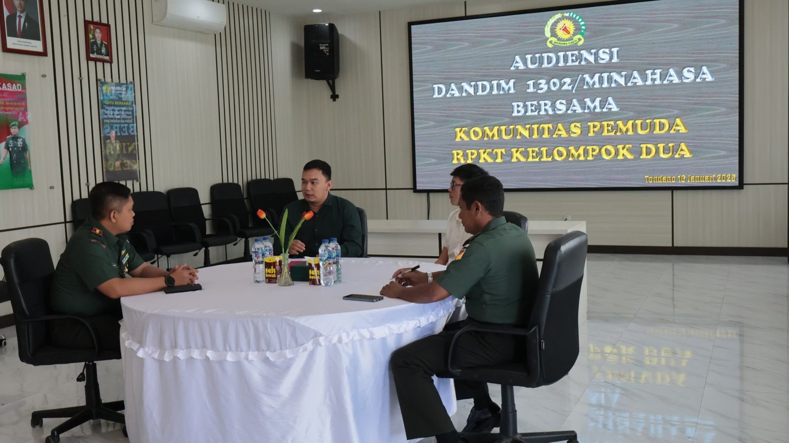 Minahasa, -Bertampat di Aula Darmawangsa Makodim, Dandim 1302/Minahasa Letnan Kolonel ( Letkol ) Inf Mutakbir menerima Audience Ketua Pemuda GMIM Desa Taraitak, Kecamatan Langowan, Kabupaten Minahasa Ivan Welang pada Kamis 16/01/2025 pukul 10.00 Wita.