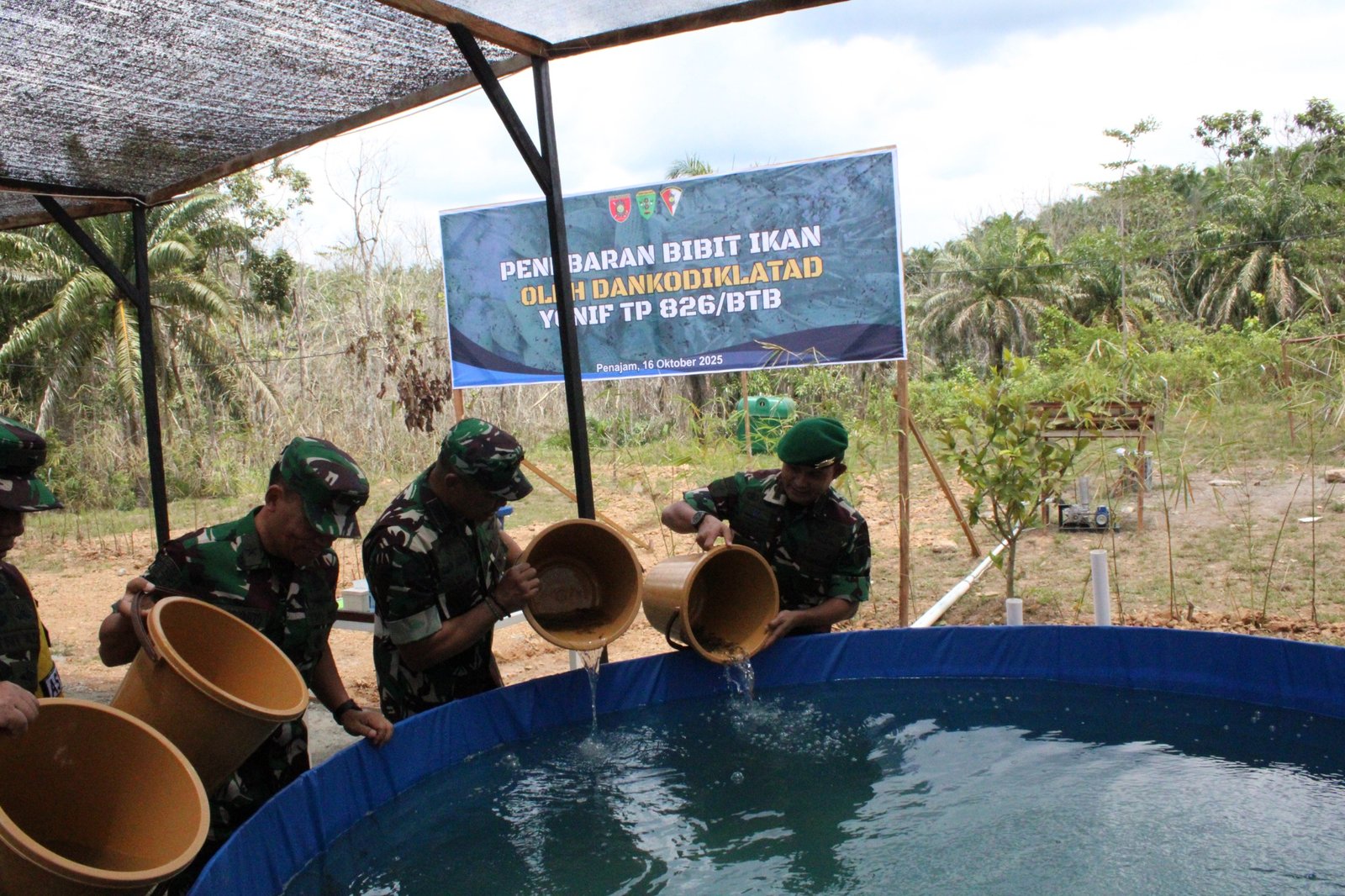 Penajam Paser Utara – Dalam rangka mendukung program Integrated Farming System (IFS) yang digagas oleh Komando Atas, Komandan Komando Pendidikan dan Latihan Angkatan Darat (Dankodiklatad) Letnan Jenderal TNI Mohamad Hasan melaksanakan kegiatan penebaran bibit ikan di area kolam budidaya Marshalling Area (MA) Yonif TP 826/Benuo Taka Bekerai, pada Kamis (16/10/2025).