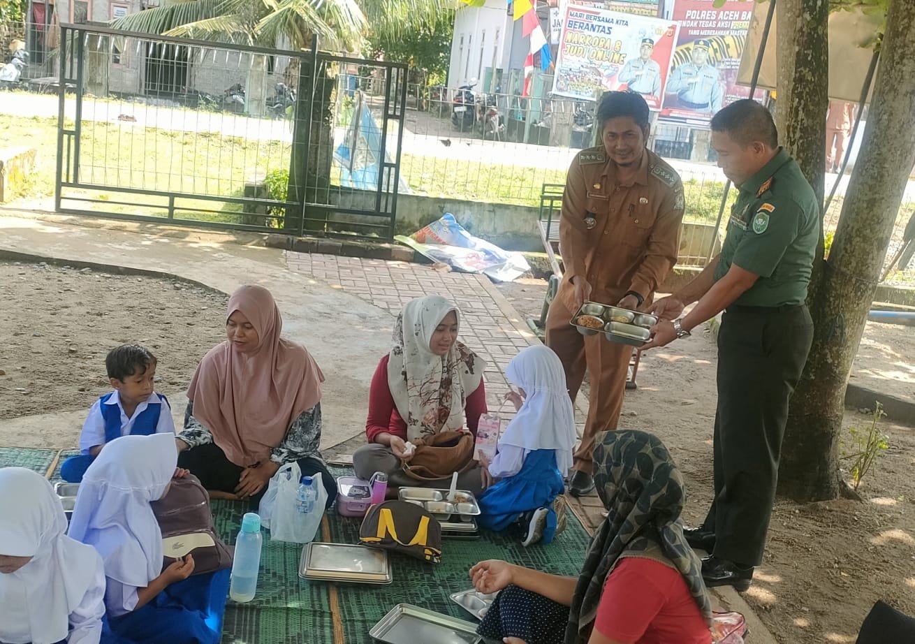 ACEH BARAT – Danramil 08/Arongan Lambalek Kodim 0105/Aceh Barat, Kapten Inf Herinizal, S.Sos., bersama Camat Arongan Lambalek, Khairul Diansyah Putra, S.STP., melakukan pemantauan pelaksanaan Program Makan Bergizi Gratis (MBG) di TK Negeri 05 Arongan, Desa Panton Bahagia, Kecamatan Arongan Lambalek, Kabupaten Aceh Barat, Kamis (06/11/2025).