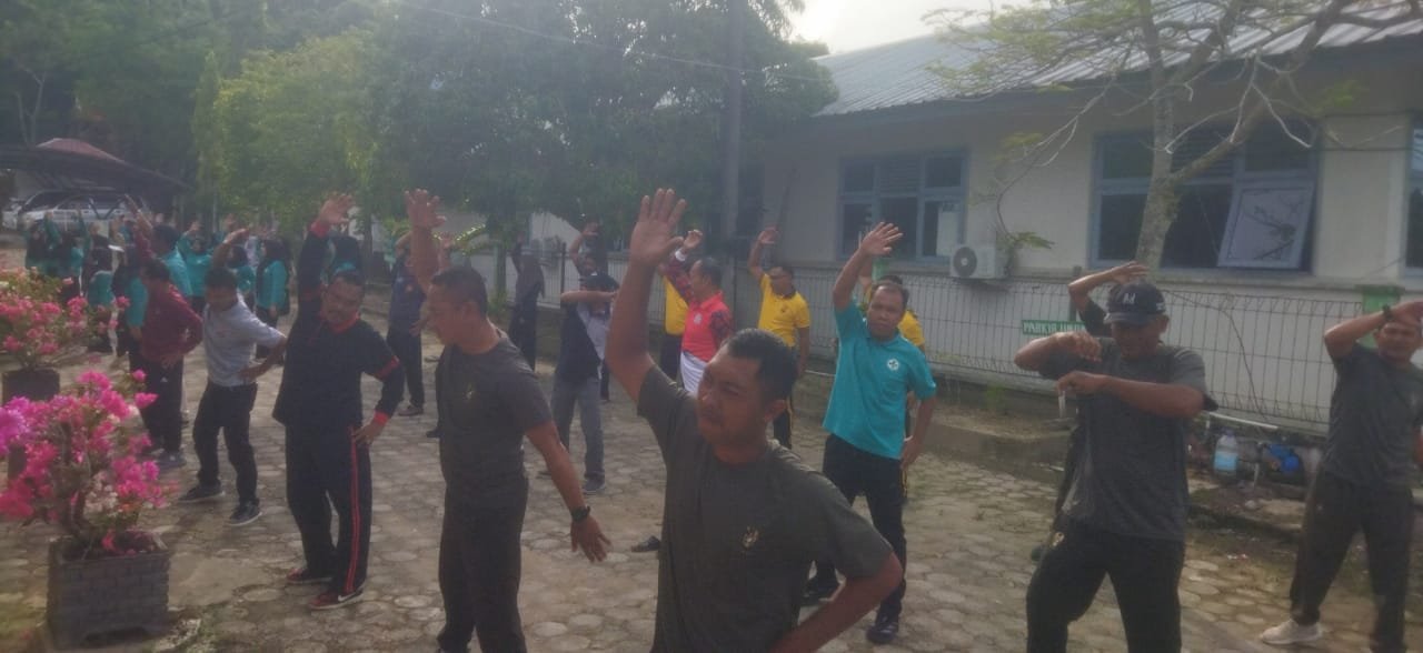 ACEH JAYA — Danramil 03/Setia Bakti Kodim 0114/Aceh Jaya, Kapten Inf Ahmad Asyhur Arifin, bersama anggota melaksanakan kegiatan senam bersama lintas sektor Forkopimcam di halaman Puskesmas Lageun, Desa Lhok Geulumpang, Kecamatan Setia Bakti, Kabupaten Aceh Jaya.