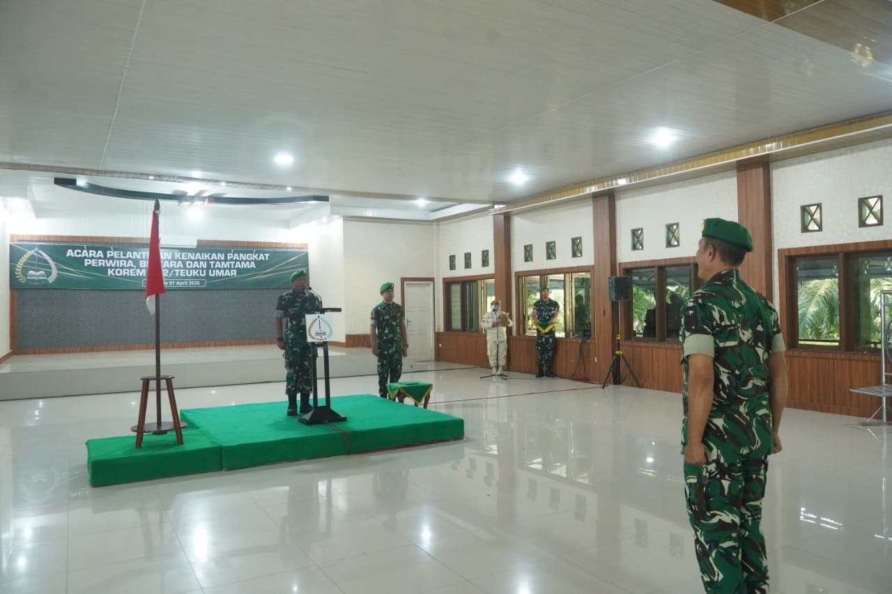 Aceh Barat – Komandan Korem 012/Teuku Umar (Danrem 012/TU) memimpin langsung pelaksanaan acara Korps Raport Kenaikan Pangkat bagi prajurit jajaran Korem 012/TU periode 1 April 2026. Kegiatan berlangsung khidmat dan penuh rasa bangga, diikuti oleh para perwira, bintara, tamtama, serta pengurus Persit KCK Koorcab Rem 012.