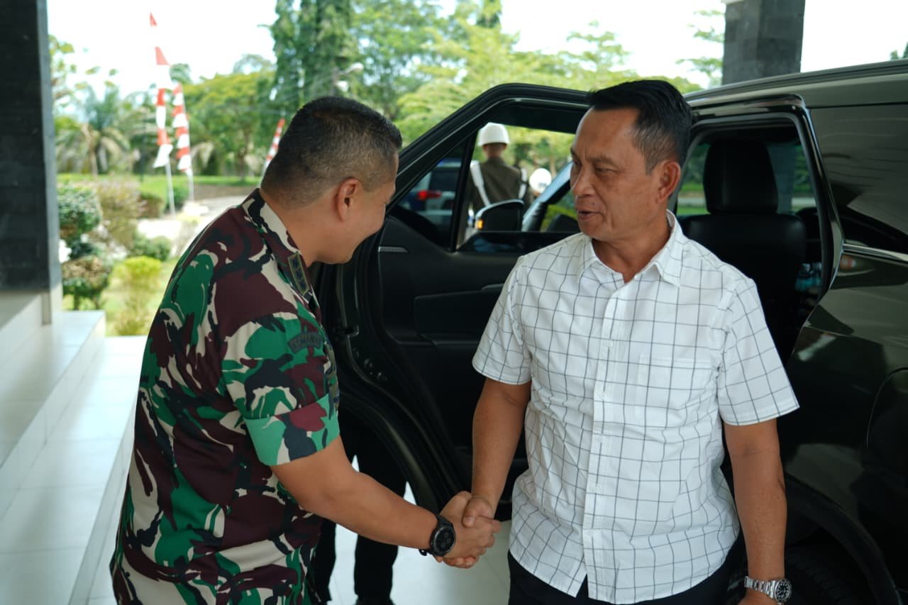 ACEH BARAT — Komandan Korem 012/Teuku Umar, Kolonel Inf Benny Rahadian, S.H., M.Han., bersama Ketua Persit Kartika Chandra Kirana Koorcab Rem 012 PD Iskandar Muda, Ny. Rina Benny Rahadian, menyambut kedatangan Kepala Staf Kodam IM, Brigjen TNI Ayi Supriatna, S.I.P., M.M., beserta rombongan di Makorem 012/TU.