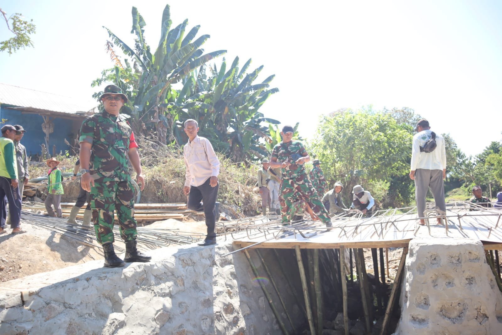 Didampingi Wadan Satgas Mayor Inf Dahlan, S.Sos., Dansatgas memeriksa pondasi jembatan, kualitas material, dan progres pemasangan rangka. Ia memberikan arahan kepada personel di lapangan untuk selalu mengutamakan keamanan dan kekuatan konstruksi.
