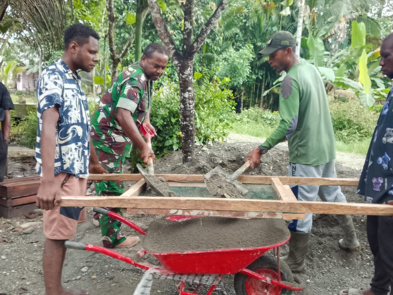Dalam upaya memastikan kelancaran dan pencapaian target pembangunan pada program TMMD ke-124, anggota Koramil 03/KK, Sertu Hendrik Maraki secara nominatif terlibat sebagai Satgas TMMD, telah berada di lokasi lebih awal sebagai helper tukang TMMD di lokasi Sasaran Pembangunan MCK sasaran ke-6, Kampung Naena Mukti pura, Distrik Iwaka, yang progresnya sdh mencapai 40%.