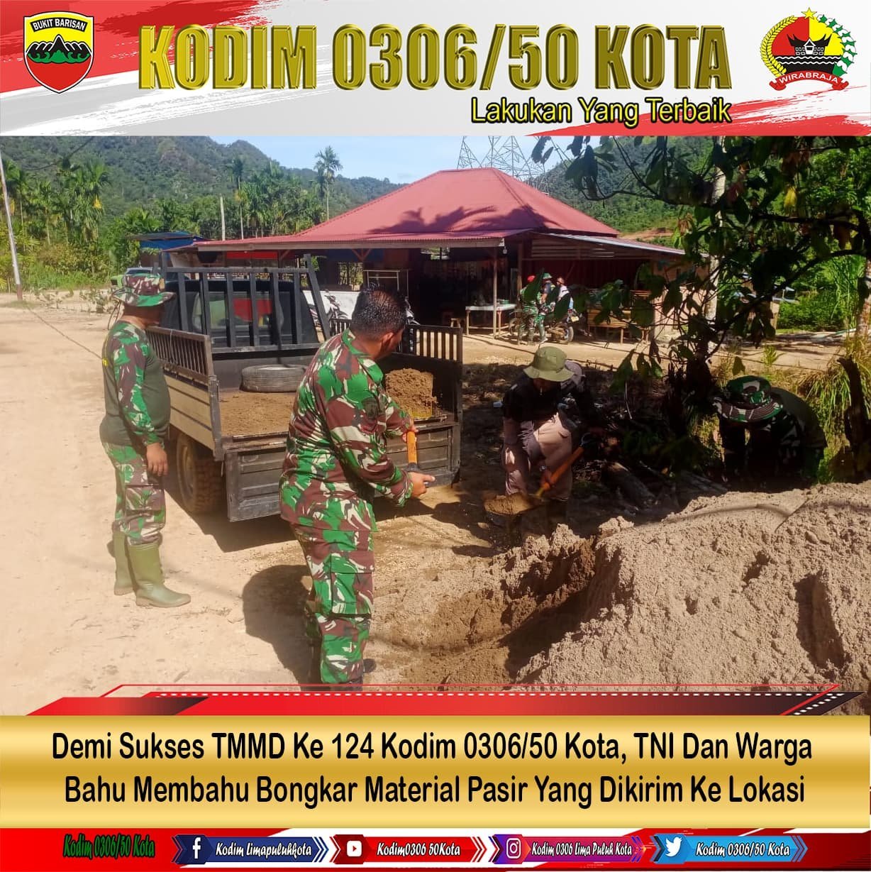 Sementara itu Koordinator Lapangan TMMD ke 124 Kodim 0306/50 Kota yang juga merupakan Pasi Teritorial Kodim mengungkapkan, setiap hari material pasir sampai ketempat pekerjaan akan mempermudah Satgas TMMD 124 dalam mengerjakan pengecoran jalan dan kegiatan fisik lainnya.