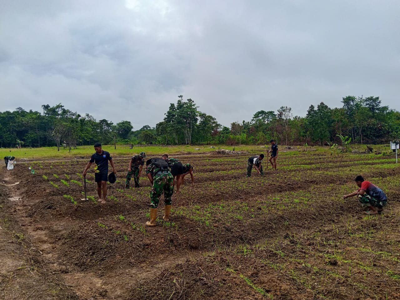 Para prajurit TNI melaksanakan pekerjaan dengan penuh kedisiplinan dan tanggung jawab tinggi. Setiap langkah diperhatikan secara detail agar penanaman dapat berjalan efektif dan memberikan hasil panen maksimal.
