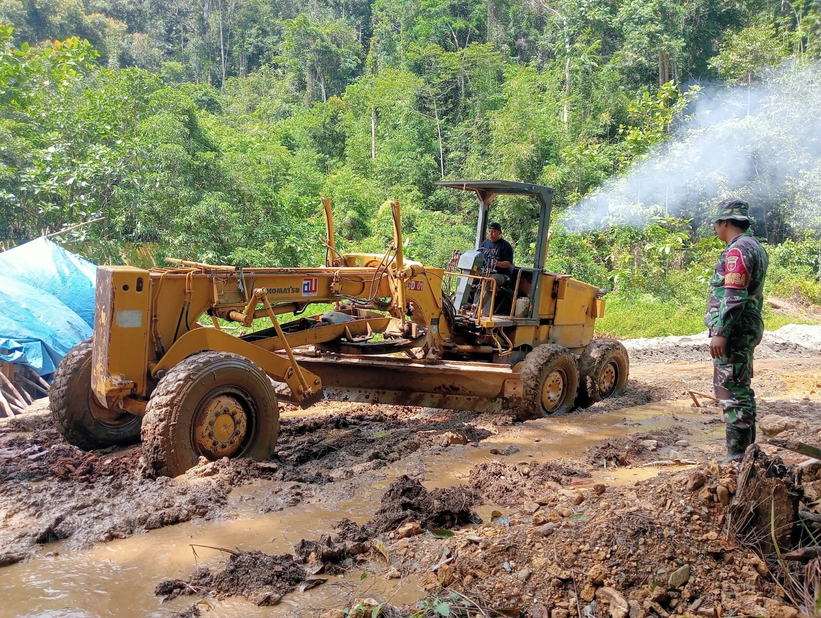 Kolaka Timur, 30 Oktober 2025 — Dalam pelaksanaan program TMMD ke-126 di Desa Tongauna, Kecamatan Uessi, Kabupaten Kolaka Timur, semangat para prajurit TNI terus menyala meskipun harus bekerja di medan berat. Kondisi jalan berlumpur akibat hujan deras tidak menyurutkan langkah Babinsa untuk memastikan kendaraan pengangkut material tetap bisa melintas dengan aman.
