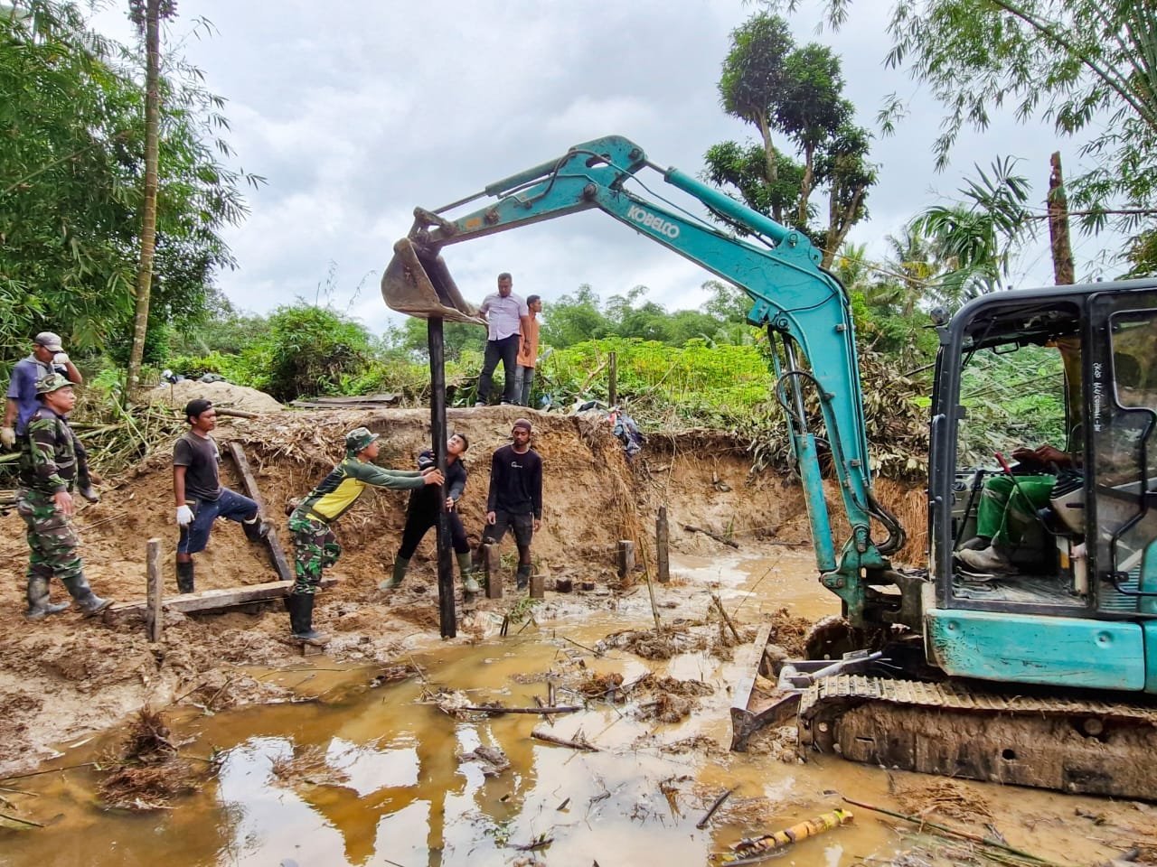 Prajurit TNI, warga dan polisi yang tergabung dalam satgas TMMD Ke -123 ini tampak begitu gigih dibantu alat berat untuk mempercepat pemasangan tiang pancang.