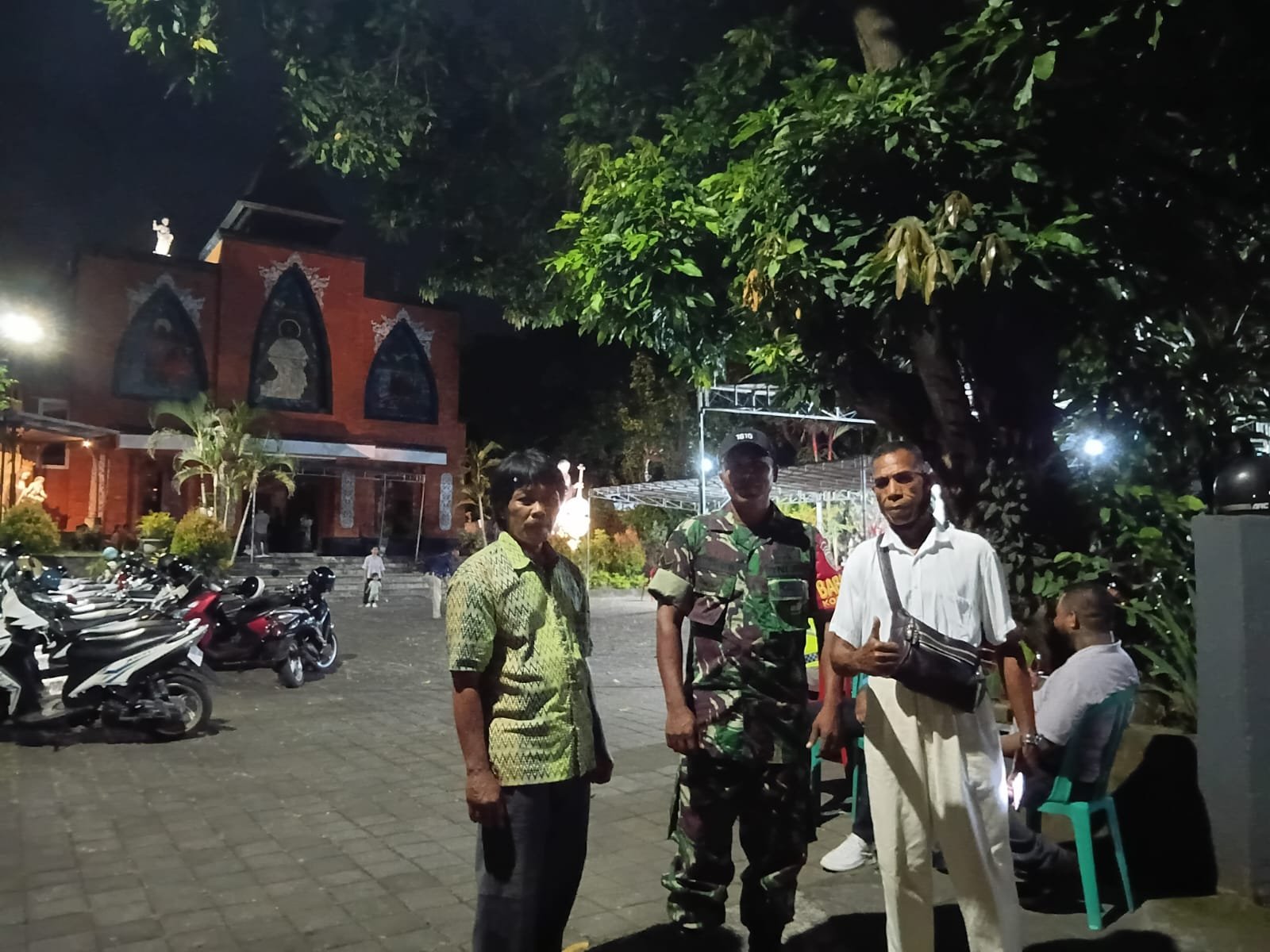 Babinsa Semarapura Tengah Sertu Wayan Darwa yang turun langsung ke lokasi menegaskan bahwa guna memastikan rangkaian persembahyangan umat Kristiani berjalan aman dan lancar, kami hadir melaksanakan pengawalan dan pengamanan.