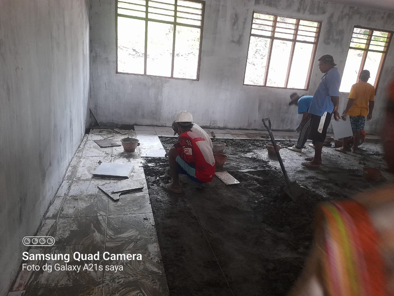 Setiap keping keramik dipasang dengan cermat untuk memastikan permukaan lantai yang rapi, kuat, dan tahan lama. Pekerjaan ini bukan sekadar merampungkan pembangunan, tetapi juga memastikan kenyamanan bagi siswa yang akan menggunakan fasilitas ini.