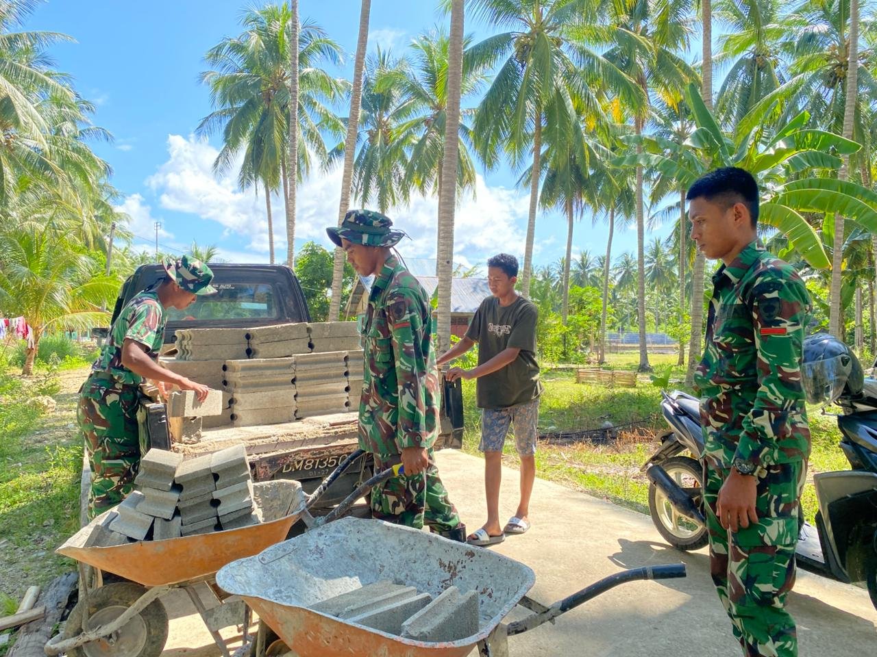Alih-alih menunggu seluruh material berkumpul di satu titik besar, personel Satgas memilih strategi melangsir atau mendekatkan material langsung ke titik-titik pembangunan Rumah Tidak Layak Huni (RTLH) dan fasilitas MCK umum yang tersebar di beberapa lokasi.