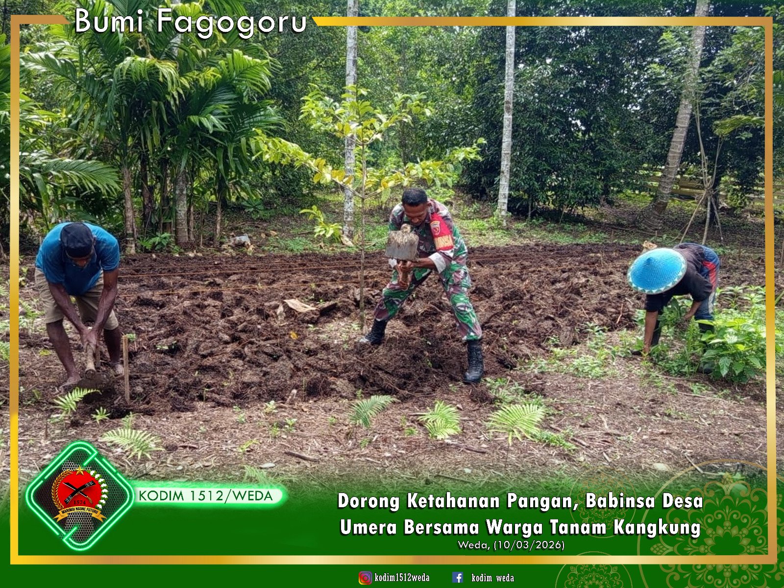Halmahera Tengah-Babinsa Umera Kopda Marsili melaksanakan kegiatan Karbak (Hanpangan), membantu garap lahan untuk menanam kangkung milik Bapak Abdul Manan Bersama Ibu Toyani dan Bapak Jahfar bertempat di Desa. Umera Kecamatan Pulau Gebe Kabupaten Halmahera Tengah.Selasa, (10/03/2026)