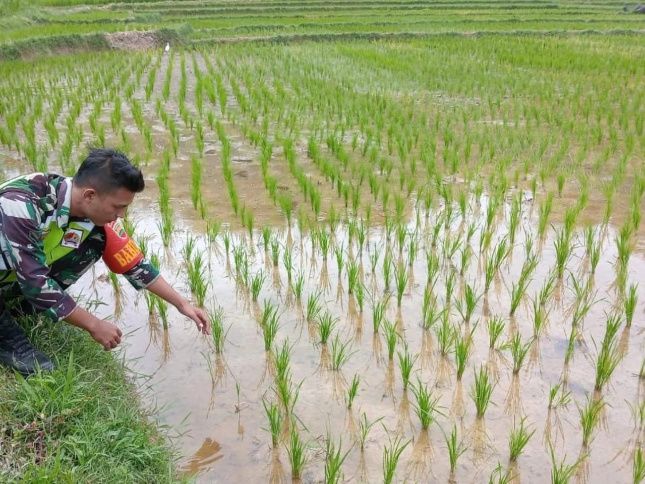 Babinsa Koramil 05/X Koto Diatas Kodim 0309/Solok Serda Arioga Siregar melaksanakan pendampingan swasembada pangan memantau perkembangan pertumbuhan padi milik petani Bapak Timbun di wilayah binaan Nagari Paninjauan, Kec. X Koto Diatas, Kab. Solok, Selasa 31 Desember 2024.