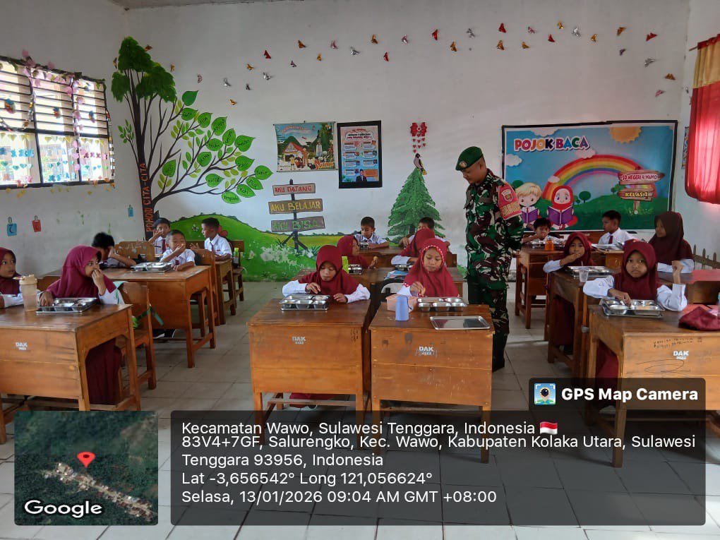 Adapun kegiatan pemantauan dan pendampingan ini berlangsung di Desa Wawo, Kecamatan Ranteangin, Kabupaten Kolaka Utara. Dalam pelaksanaannya, Babinsa turut berkoordinasi dengan pihak terkait guna memastikan kelancaran distribusi MBG kepada para siswa.