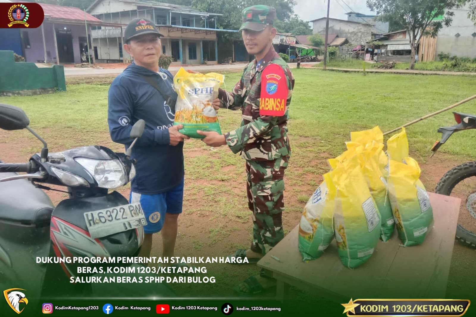 Ketapang – Dalam rangka mendukung program pemerintah untuk menjaga stabilitas harga beras di pasaran, Kodim 1203/Ketapang turut serta menyalurkan beras Stabilisasi Pasokan dan Harga Pangan (SPHP) dari Bulog kepada masyarakat di wilayah Kabupaten Ketapang.”Rabu(13/09/2025)