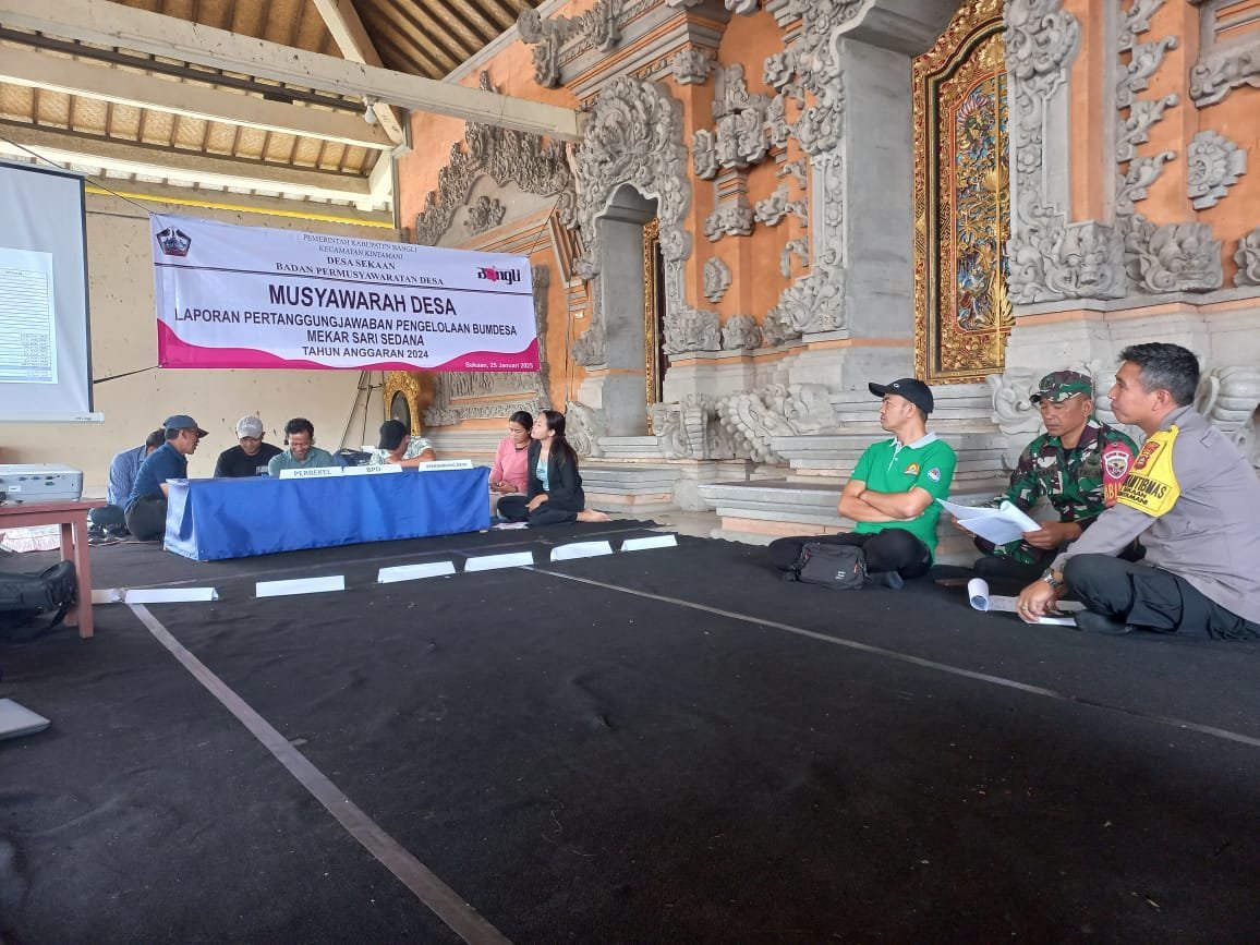 Bangli – Babinsa Koramil 1626-04/Kintamani Rapat menghadiri Musdes Pertanggung Jawaban Pengelolahan Bumdes Mekar Sari Desa Sekaan di wilayah binaanya yang berlokasi di desa Sekaan, Kecamatan, Kintamani Kabupaten Bangli, Sabtu (25/01/25).