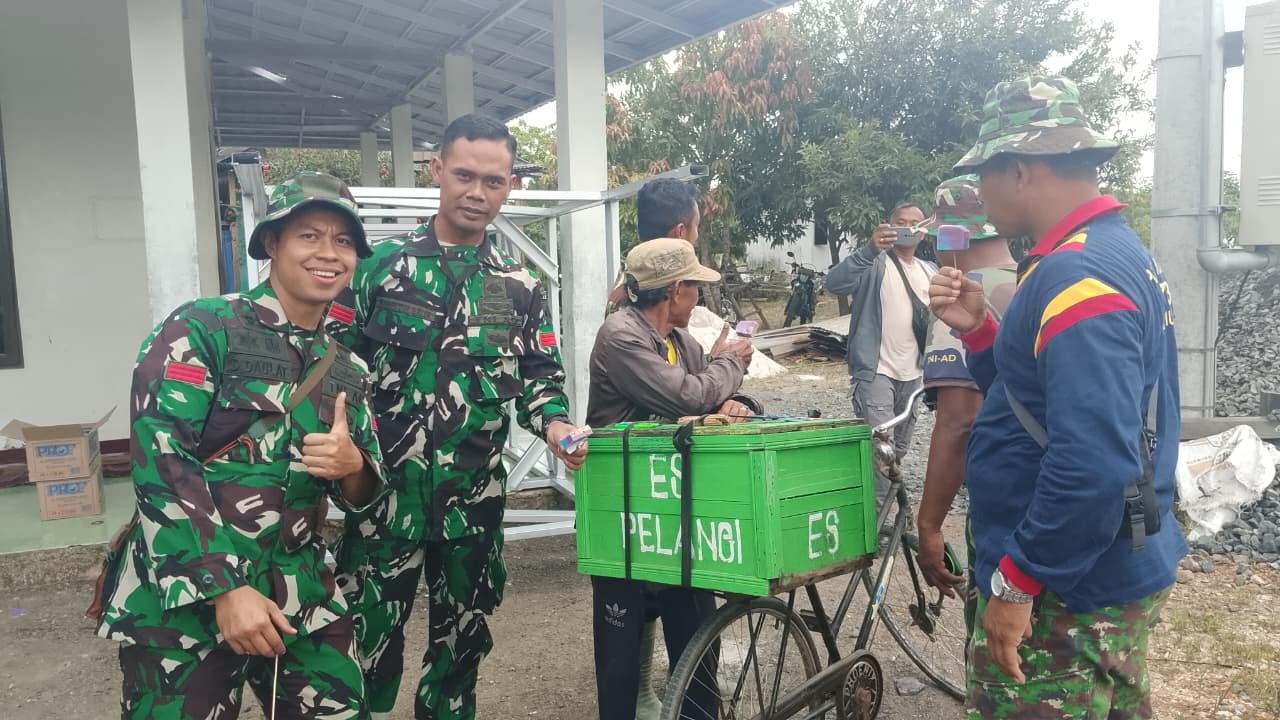 Setiap hari, suasana akrab tercipta ketika warga bernama Asnawi datang mengayuh sepeda tuanya sembari menjajakan dagangan es pelangi kepada para anggota satgas TMMD.