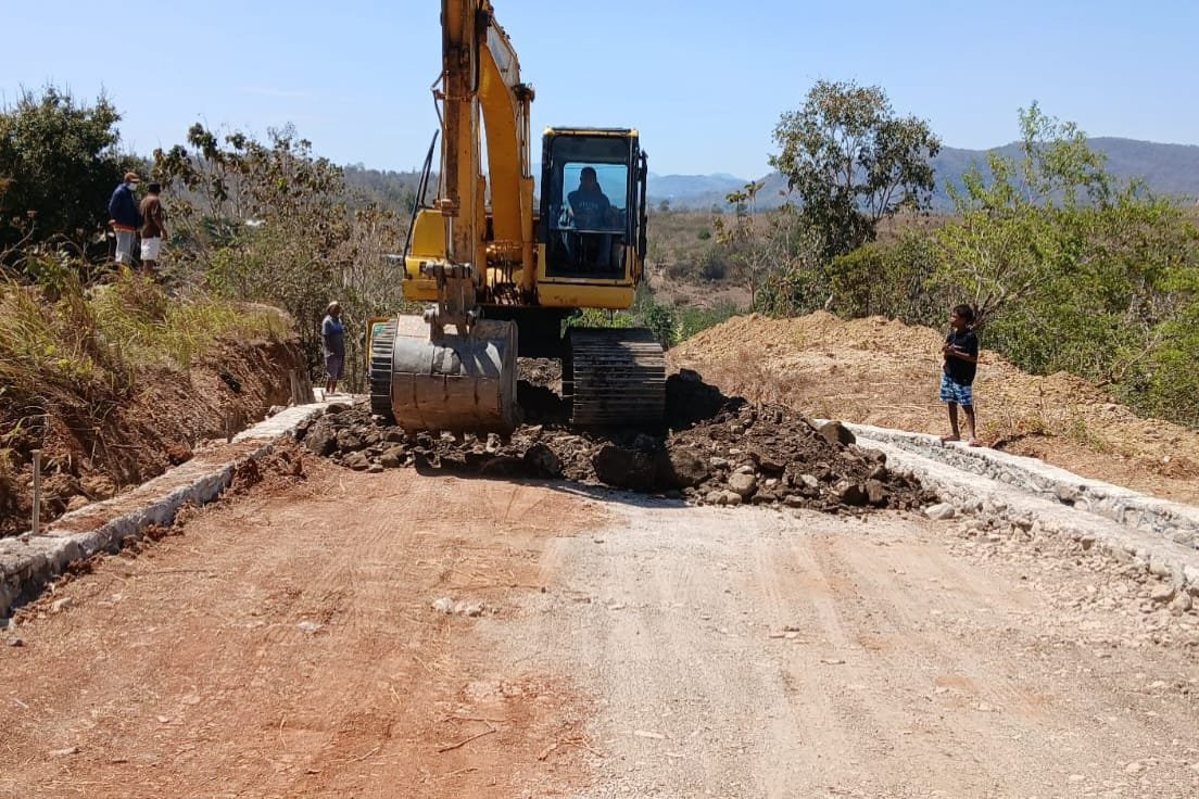 Belu – Demi mempercepat pembangunan jalan sepanjang 625 meter dalam program TMMD ke-125, Satgas Kodim 1605/Belu menggunakan alat berat excavator untuk membantu proses pemerataan timbunan, Selasa (19/8/2023).