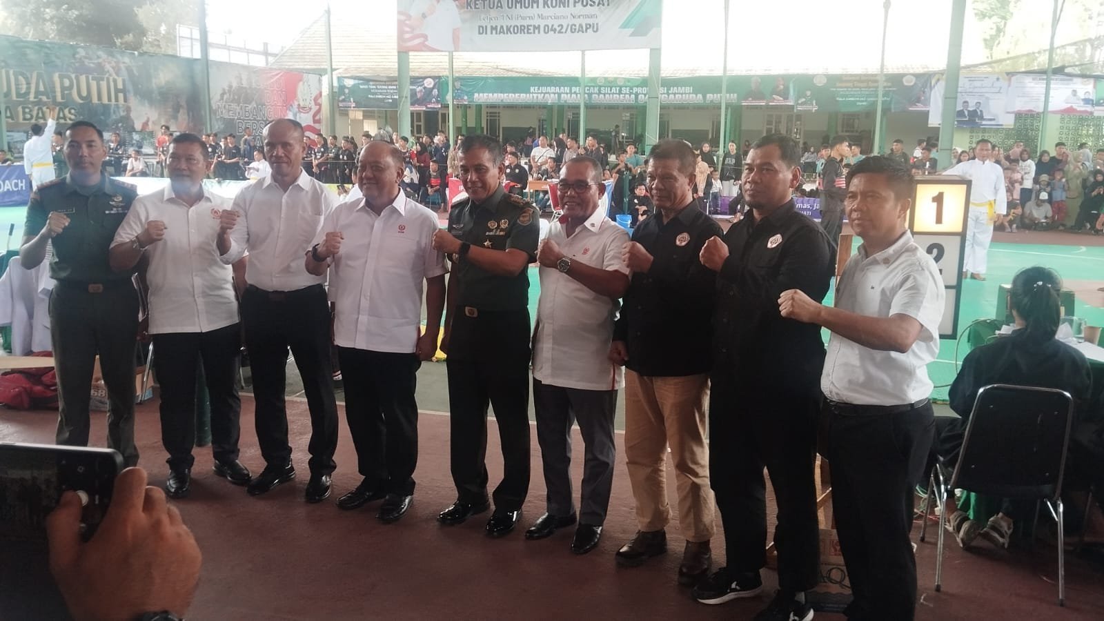 Jambi, 11 Agustus 2025 – Sorak sorai penonton memecah suasana di hari ketiga Open Turnamen Piala Danrem 042/Gapu dalam rangka HUT RI Ke-80 Tahun 2015. Final pencak silat yang berlangsung sengit menjadi momen bersejarah ketika Ketua KONI Pusat Letjen TNI (Purn) Marciano Norman hadir langsung di arena, didampingi Kasipers Kasrem 042/Gapu Kolonel Arh Agus Setiawan, ST. Kehadiran tokoh olahraga nasional ini sontak membakar semangat para atlet yang berlaga.