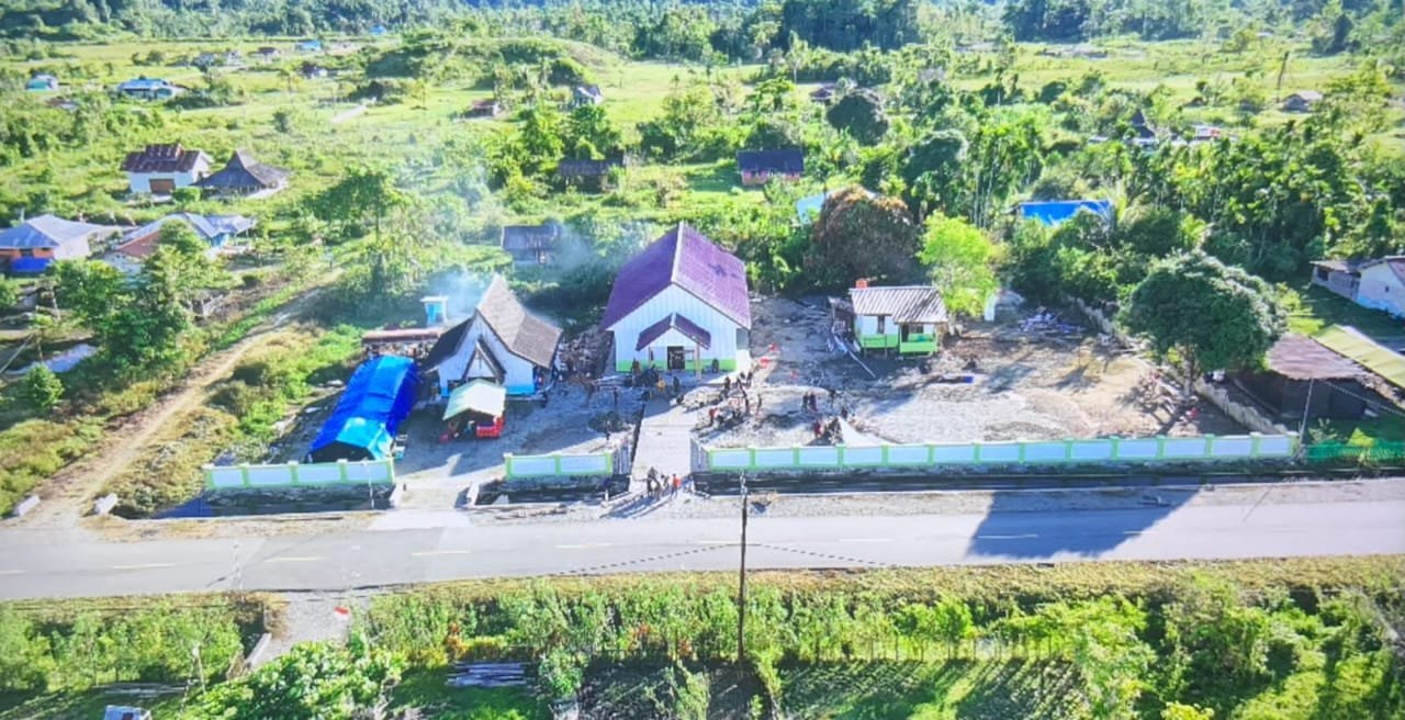 Nabire – Foto udara yang diambil dari lokasi pelaksanaan TMMD ke-125 Kodim 1705/Nabire di Kampung Manunggal Jaya, Legari SP4, Distrik Makimi, Kabupaten Nabire, memperlihatkan pemandangan indah hasil pembangunan yang hampir rampung. Seluruh sasaran fisik mulai dari rumah pastori, gapura gereja, hingga sumur bor dan fasilitas penunjang lainnya tampak berdiri kokoh dan rapi.