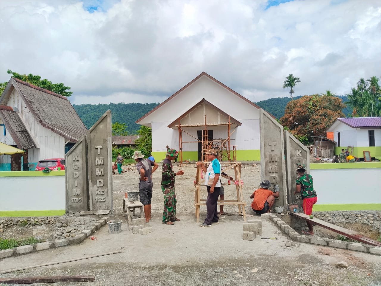 Nabire, 15 Agustus 2025 – Pembangunan gapura Gereja GKI Talitakum yang menjadi salah satu sasaran fisik TMMD ke-125 TA 2025 Kodim 1705/Nabire di Kampung Manunggal Jaya, Legari SP4, Distrik Makimi, kini hampir rampung. Progres pengerjaan telah mencapai lebih dari 90 persen dan tinggal tahap finishing.