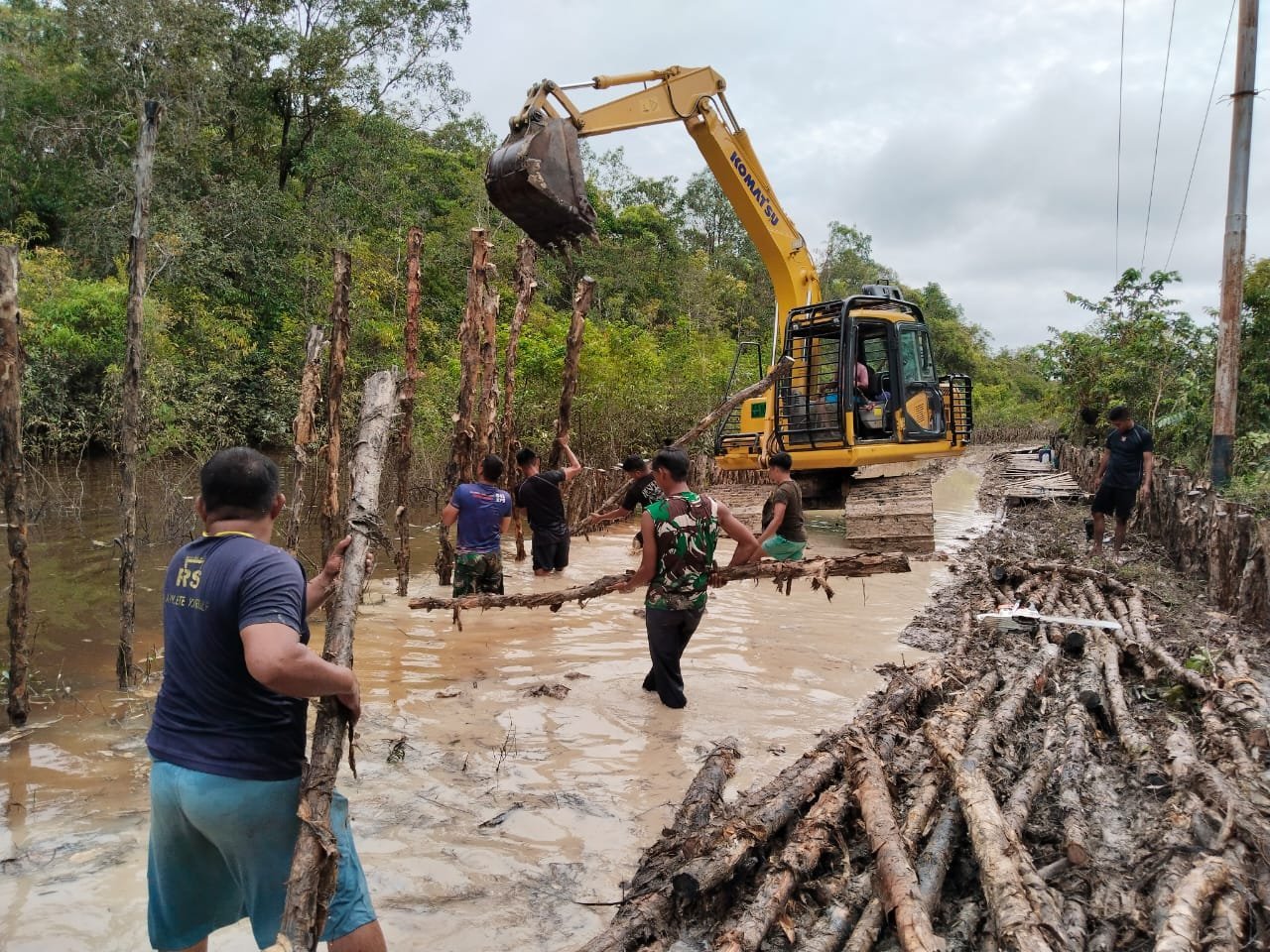 Barito Selatan – Kondisi lokasi yang dipenuhi air dan lumpur setinggi lutut tak menjadi alasan bagi anggota Satgas TMMD Ke-124 Kodim 1012/Buntok untuk berhenti bekerja. Di bawah terik matahari dan genangan air, mereka tetap melaksanakan pemasangan cerucuk untuk menopang badan jalan yang sedang dibuka.