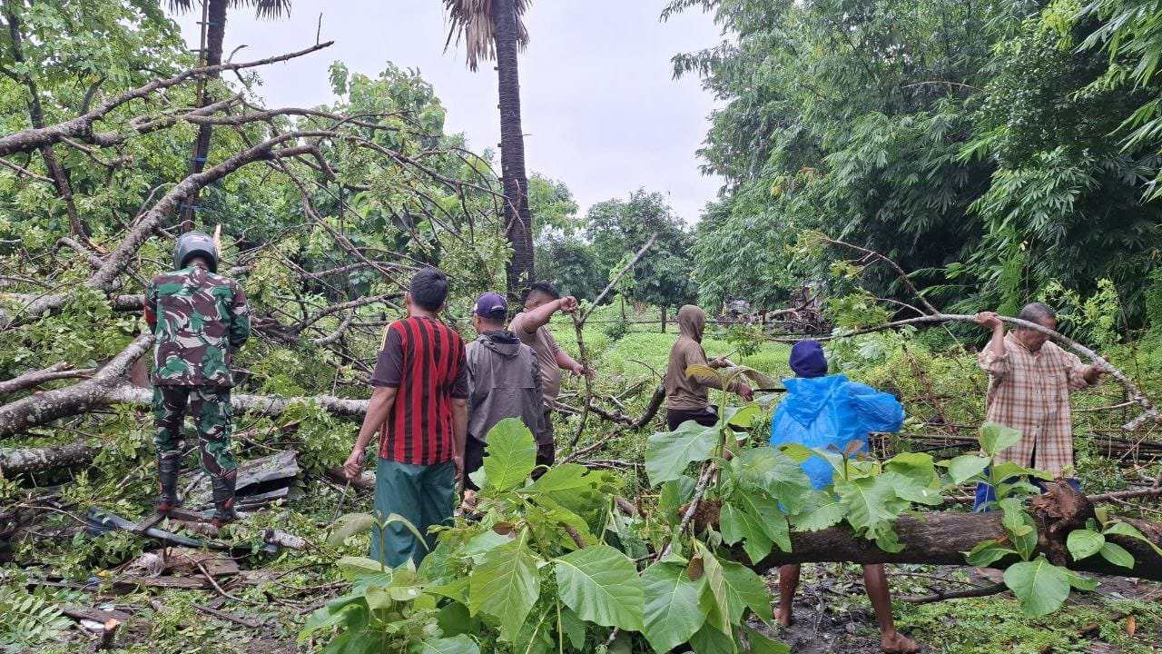 TAKALAR – Babinsa Koramil 1426-03/Galut Kodim 1426/Takalar Desa Maccini Sombala Serma Sahrir bersama warga masyarakat bahu membahu membersihkan pohon yang tumbang menimpa rumah kebun warga dan tiang listrik, yang berlokasi di Desa Maccini Sombala Kecamatan Galesong Utara Kabupaten Takalar, Minggu (09/02/2025)