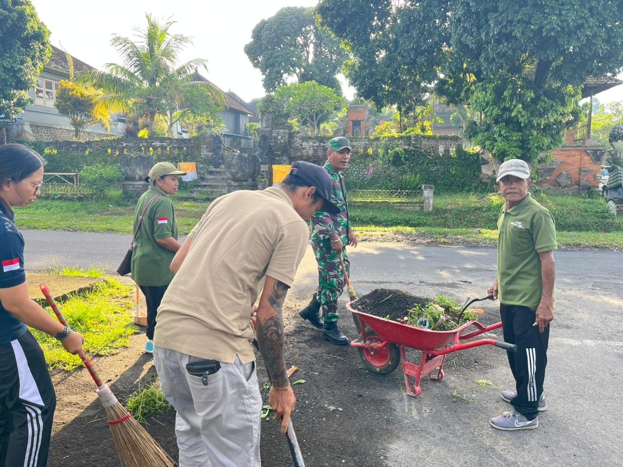 Klungkung,- Kebersamaan dan kemanunggalan Babinsa bersama seluruh pihak di wilayah binaan kembali ditunjukkan Babinsa Nyalian Koramil 1610-02/Banjarangkan KopTu Gede Raka saat melaksanakan kegiatan gotong royong, Minggu ( 26/10/25 ).
