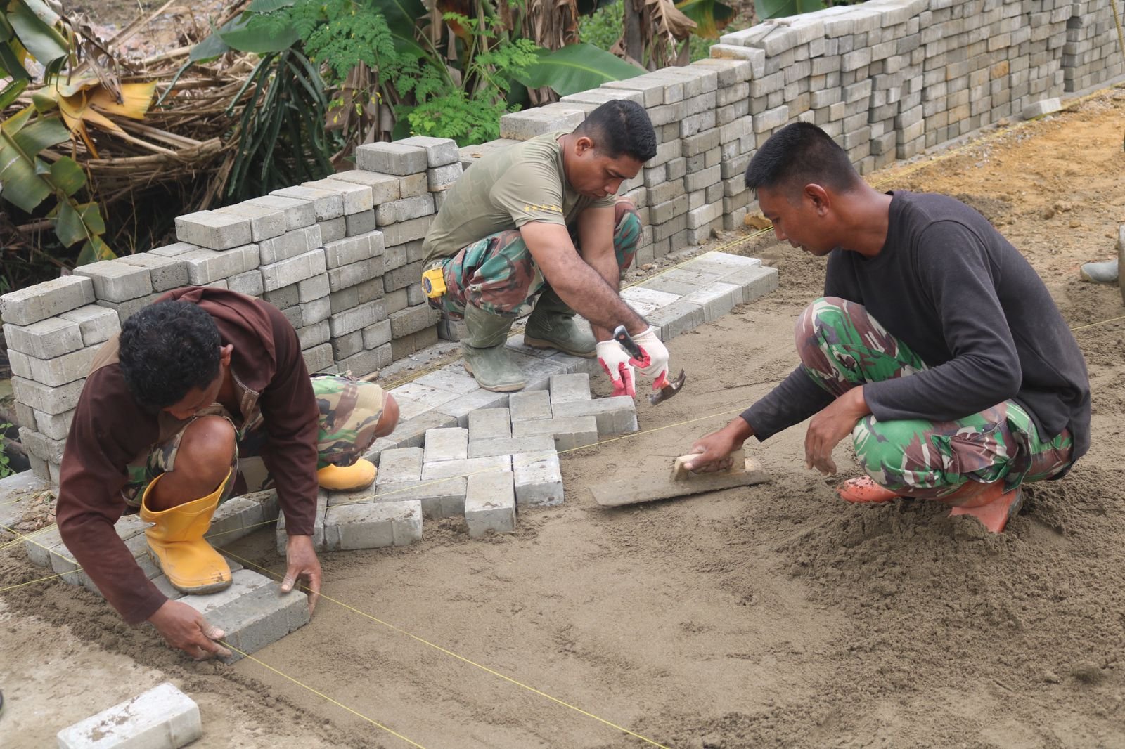 Sejak pagi hari, prajurit TNI dan warga tampak kompak meratakan permukaan tanah sebagai dasar sebelum pemasangan paving dilakukan secara bertahap.