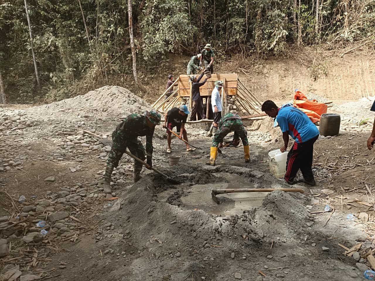 “Deker ini menjadi penghubung utama antara jalan desa dengan area perkebunan warga. Pengecoran dilakukan secara gotong royong agar pekerjaan cepat selesai dan hasilnya bisa segera dirasakan masyarakat,” ujar Kapten Inf Sulaiman.