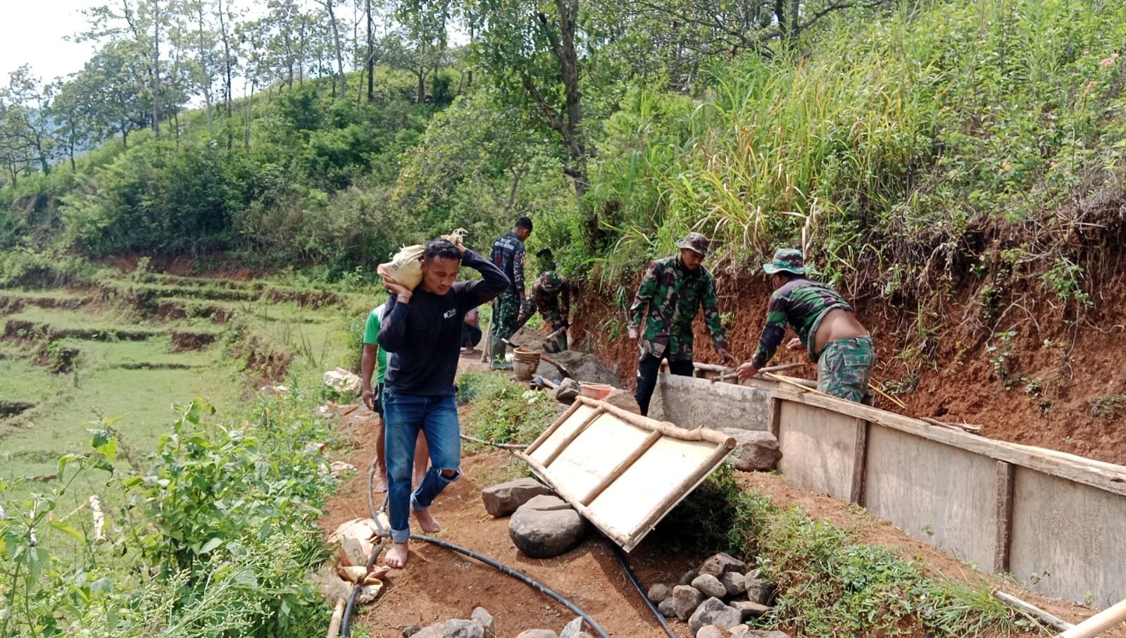 Sejak pagi, prajurit TNI bersama masyarakat tampak bekerja tanpa henti. Mereka bahu-membahu mengangkut batu dan mengecor sisa saluran sepanjang sekitar 170 meter. Meski cuaca panas dan medan menantang, semangat gotong royong tak pernah luntur.