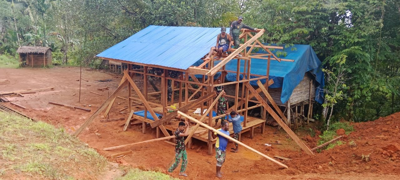 BOVEN DIGOEL – Suara palu dan gergaji kayu terdengar bersahutan di Kampung Waropko, Distrik Waropko, Kabupaten Boven Digoel. Di bawah terik matahari Papua yang menyengat, prajurit Satgas TMMD ke-126 Kodim 1711/Boven Digoel bersama masyarakat tampak bersemangat menyelesaikan pemasangan atap rumah warga yang menjadi sasaran program Rehabilitasi Rumah Tidak Layak Huni (RTLH).