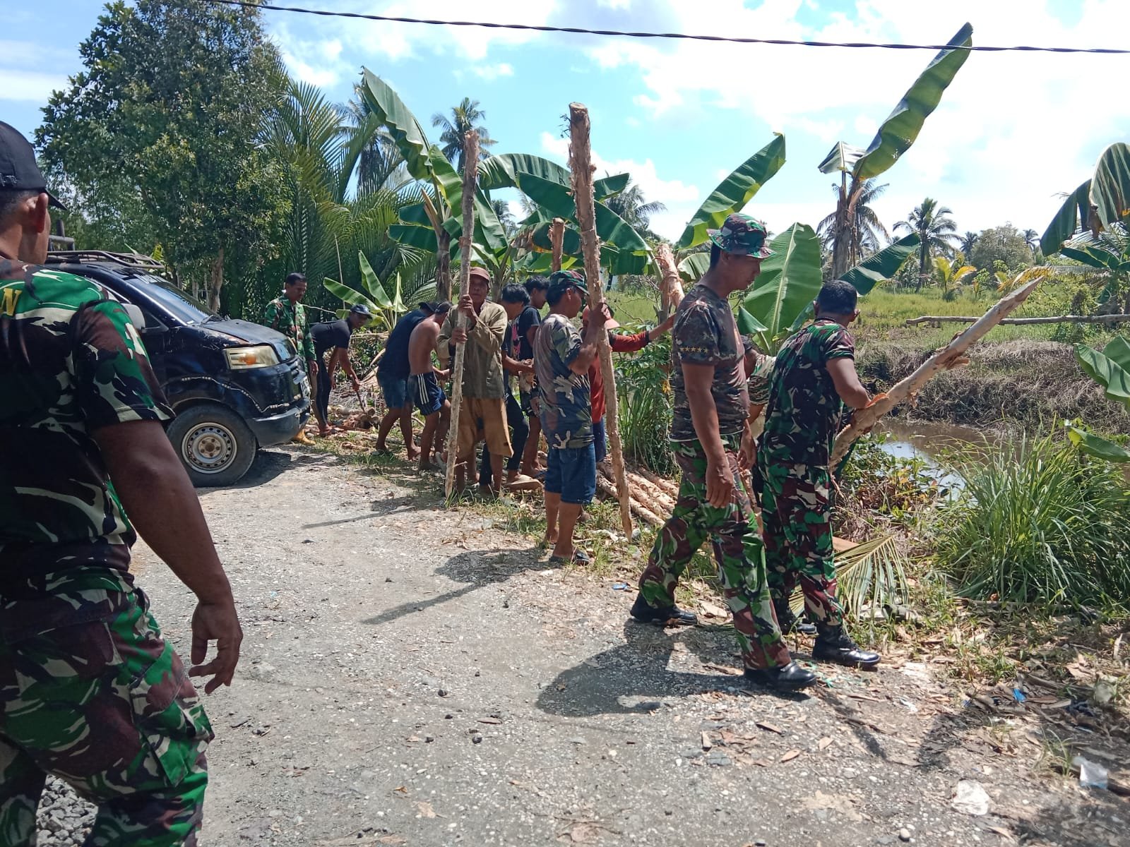 Barito Kuala – Di tengah hamparan tanah berlumpur dan aliran sungai yang membelah Desa Tamban Bangun, semangat kebersamaan antara TNI dan masyarakat tampak begitu hidup. Personel Babinsa Koramil 1005-10/Tamban bersama warga bahu-membahu membangun Jembatan Garuda, sebuah akses vital yang telah lama dinantikan masyarakat.