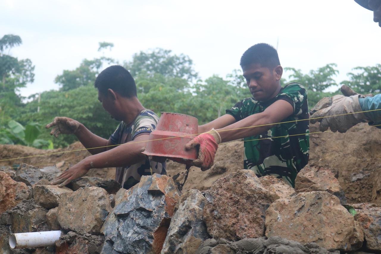 Tak hanya prajurit TNI, masyarakat setempat juga turut ambil bagian dalam proses pembangunan talud. Mereka bersama-sama mengangkat material, menyusun batu, hingga membantu proses pengadukan semen.