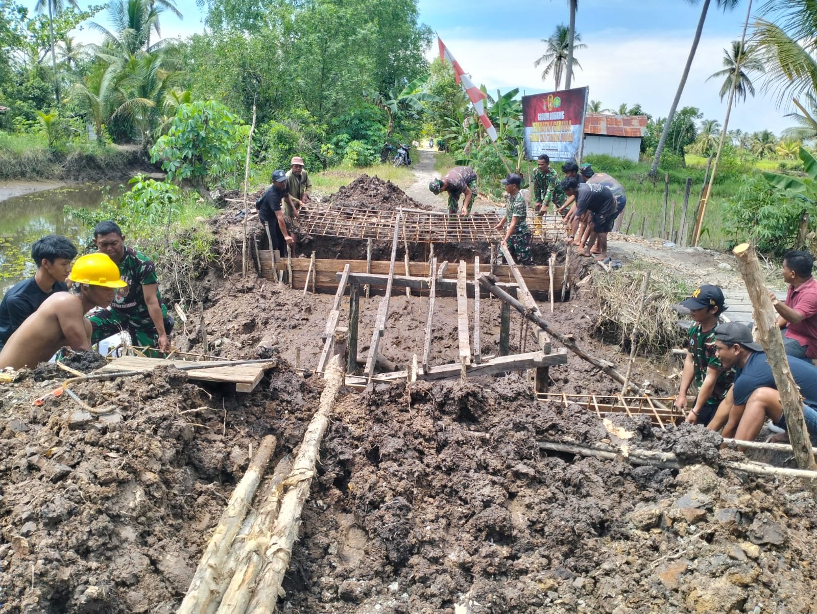 Pada Sabtu (18/4/2026), suasana gotong royong begitu terasa saat warga bersama Babinsa Koramil 1005-10/Tamban, Sertu Salim, bahu membahu mengangkat besi bantalan sebagai pondasi awal jembatan. Meski harus berjibaku dengan kondisi medan yang basah dan berlumpur, semangat kebersamaan tidak pernah surut. Canda tawa dan semangat saling membantu justru menjadi energi positif yang mengiringi setiap tahapan pekerjaan.