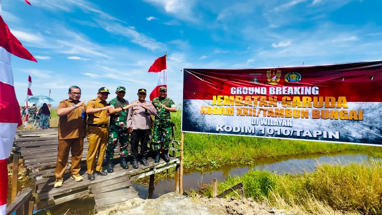 TAPIN – Komando Distrik Militer (Kodim) 1010/Tapin melaksanakan kegiatan ground breaking pembangunan Jembatan Perintis Garuda yang berlokasi di Desa Sawaja, Kecamatan Candi Laras Utara (CLU), Senin (6/4/2026). Kegiatan ini menjadi tanda dimulainya pembangunan jembatan yang diharapkan mampu meningkatkan konektivitas wilayah serta mendukung pertumbuhan ekonomi masyarakat setempat.