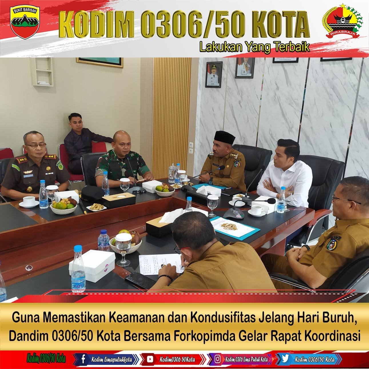 Lima Puluh Kota — Menjelang peringatan Hari Buruh Internasional yang jatuh pada 1 Mei 2025, Dandim 0306/50 Kota bersama Pemerintah Kabupaten 50 Kota menggelar rapat koordinasi guna mengambil langkah preventif terkait situasi Kamtibmas. Bertempat di Ruang Rapat Kantor Bupati, Nagari Sarilamak Kecamatan Harau. Selasa (29/4/2025).