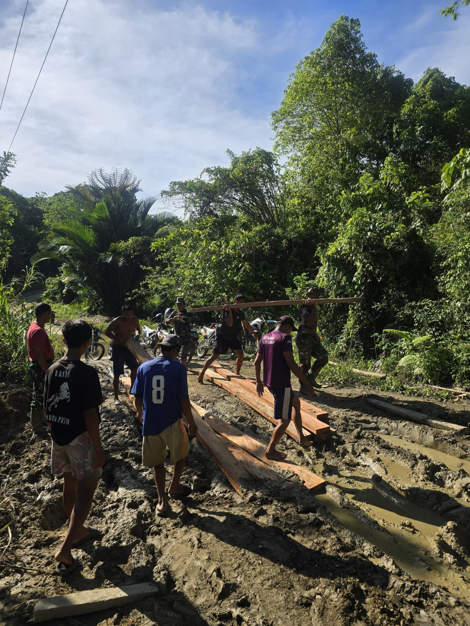 Mobil tersebut mengangkut material penting untuk proyek pembangunan sasaran fisik TMMD. Hujan deras membuat jalan menjadi licin dan berlumpur, menyebabkan kendaraan tak bisa bergerak. Dengan penuh tanggung jawab, anggota Satgas bersama warga langsung bahu membahu menarik kendaraan agar tidak menghambat proses distribusi material.