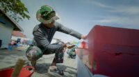Sebagian membantu mengatur material, sementara yang lain merapikan sisi badan jalan.