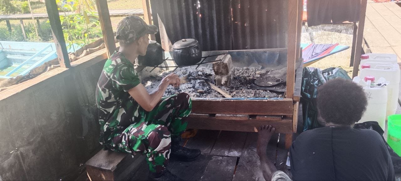 Mimika, Papua – Suasana kekeluargaan begitu terasa saat personel Satuan Tugas (Satgas) TMMD ke-124 Kodim 1710/Mimika menikmati momen masak dan makan bersama warga di Kampung Pigapu, Distrik Iwaka, Kabupaten Mimika, Minggu (25/5/2025). Kegiatan ini menjadi bagian dari upaya mempererat hubungan antara TNI dan masyarakat setempat selama pelaksanaan program TMMD.