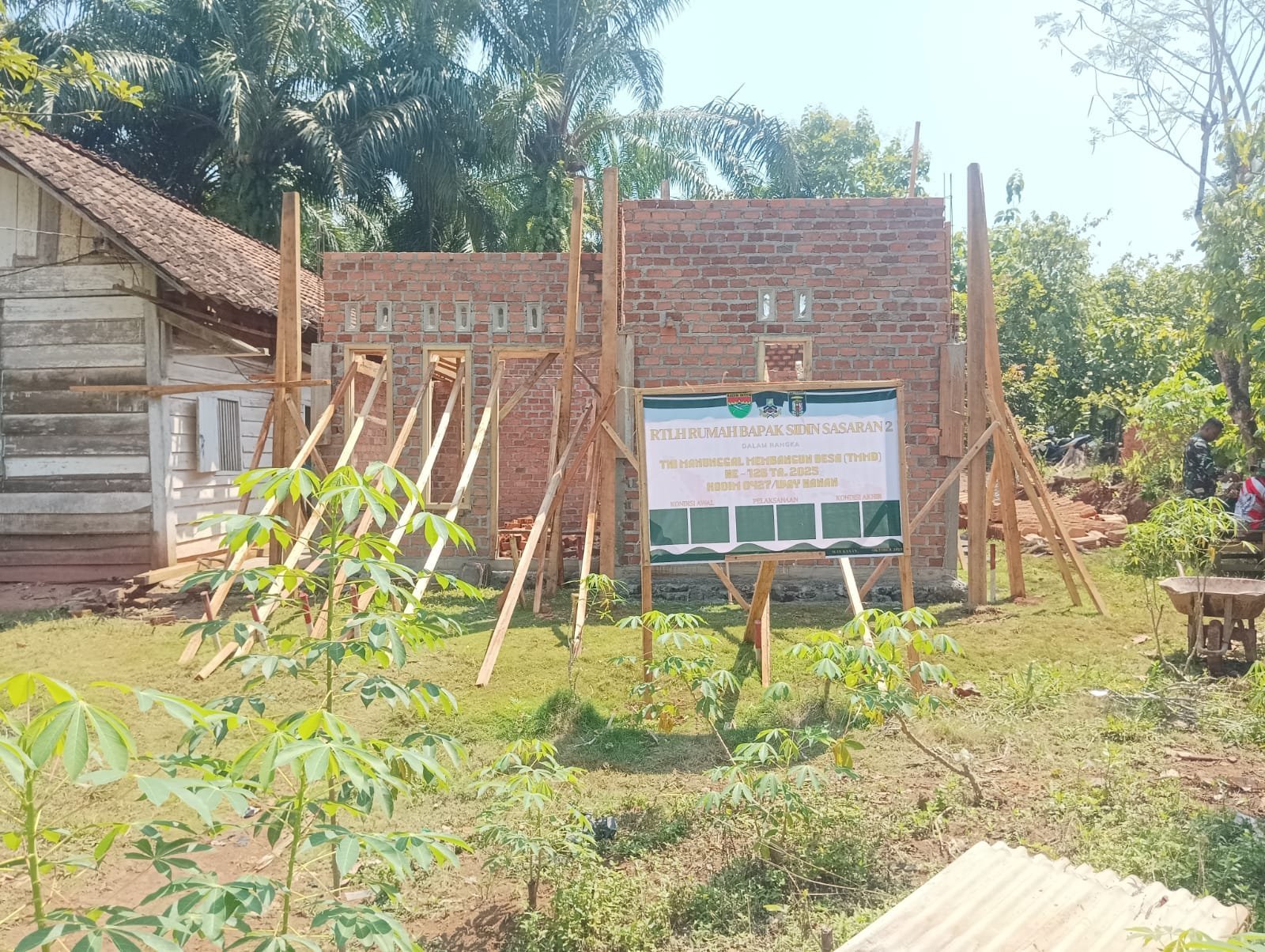 Rumah sederhana milik Bapak Sidin, yang sebelumnya jauh dari kata layak, kini telah memasuki tahap pembangunan dengan progres mencapai 45 persen. Dinding bata mulai berdiri kokoh, menggantikan bilik lama yang nyaris roboh. Pekerjaan ini dipimpin oleh Sertu Sahri Romadhon bersama Satgas TMMD dan dibantu penuh semangat oleh warga sekitar.