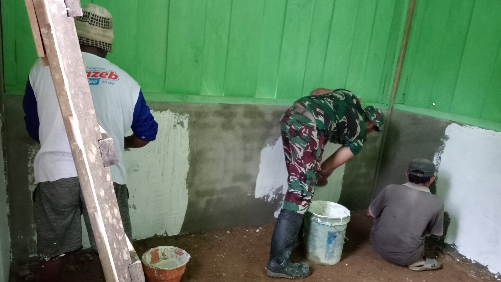 Bombana –Memasuki hari ke-19 pelaksanaan TNI Manunggal Membangun Desa (TMMD) ke-124, Satgas Kodim 1431/Bombana bersama masyarakat terus mempercepat penyelesaian Rumah Tidak Layak Huni (RTLH) milik Ibu Hasneni di Dusun 1, Desa Wia-wia, Kecamatan Matausu, Kabupaten Bombana. Hari ini, fokus kegiatan difokuskan pada proses plamir dan pengecatan dinding bagian dalam rumah.