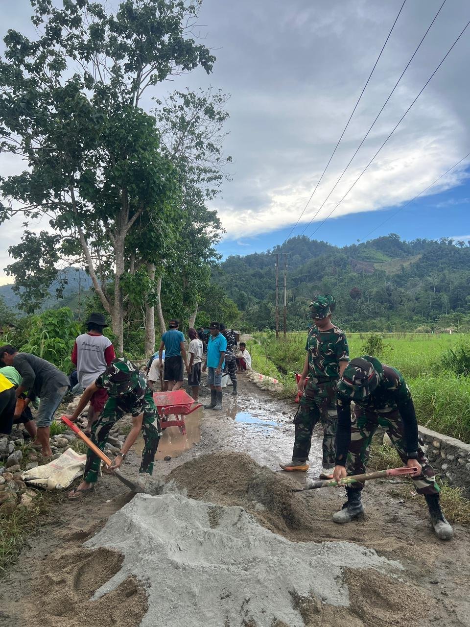Personel Satgas TMMD bersama masyarakat setempat terlihat tetap bersemangat melaksanakan pengerjaan secara gotong royong. Kegiatan meliputi pengangkutan material, perataan badan jalan, serta proses pemadatan jalan agar hasil pembangunan memiliki kualitas yang baik dan tahan lama.