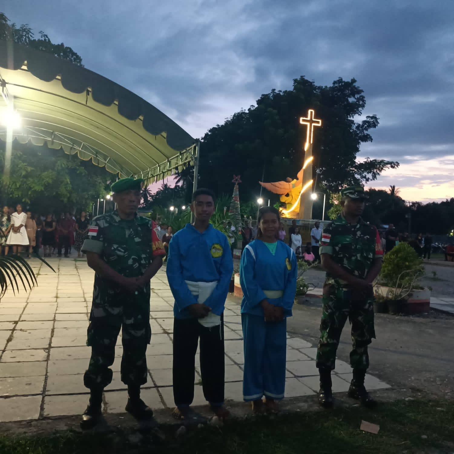 KODIM 1605/BELU, Sejumlah personil Babinsa Koramil 1605-05/Kobalima melaksanakan pengamanan Ibadah malam Natal pada sejumlah Gereja wilayah binaan Koramil Kobalima, Kabupaten Malaka, Selasa (24/12/2024).